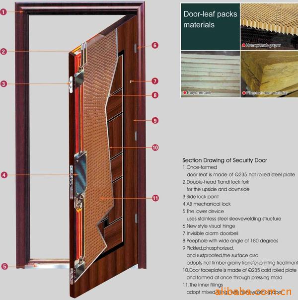 11)配件:专业的铁芯插入锁,铰链,门锁,膨胀螺栓安装,宽角度猫眼,隐蔽的门铃,橡胶密封圈