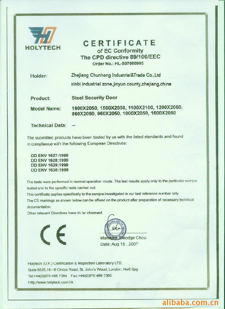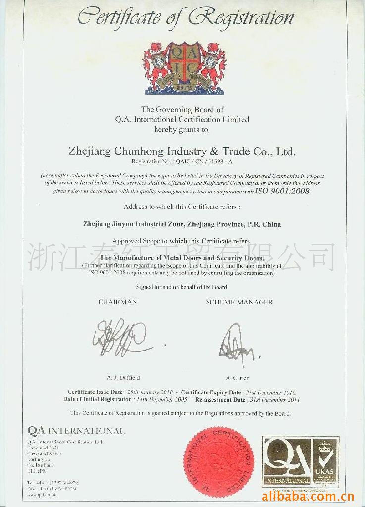 我公司生产的“正阳红牌”系列防盗门和金属入口门已通过公安部安全防防警系统产品质量监督检验测试中心的抽查,被评为“@”nz@”中国农业银行。企业;中国中轻产品质量保障中心授予“质量保证产品值得信赖的企业”;中国技术监督协会,中国质量和品牌杂志社,中国营销学会共同评估为“中国市场质量及格,服务有保证,声誉不错”的企业;被中国市场诚信调查促进会评为“AAA”单位,被浙江省五金制品协会授予“浙江五金名品”,并由浙江quality技术监督网络浙江举荐为“浙江”推荐产品服务中心质量信得过产品”等桂冠称谓。公司已赢得了自营进出口权,产品已通过AAAinternationalqualitysystem认证。