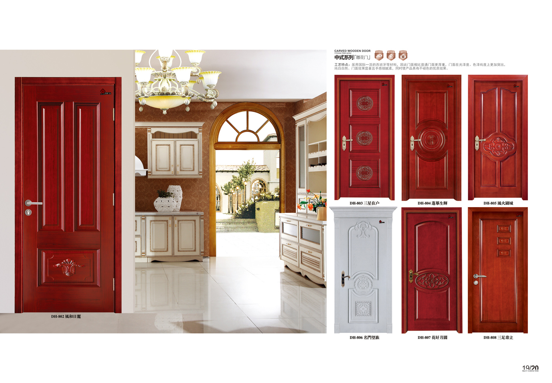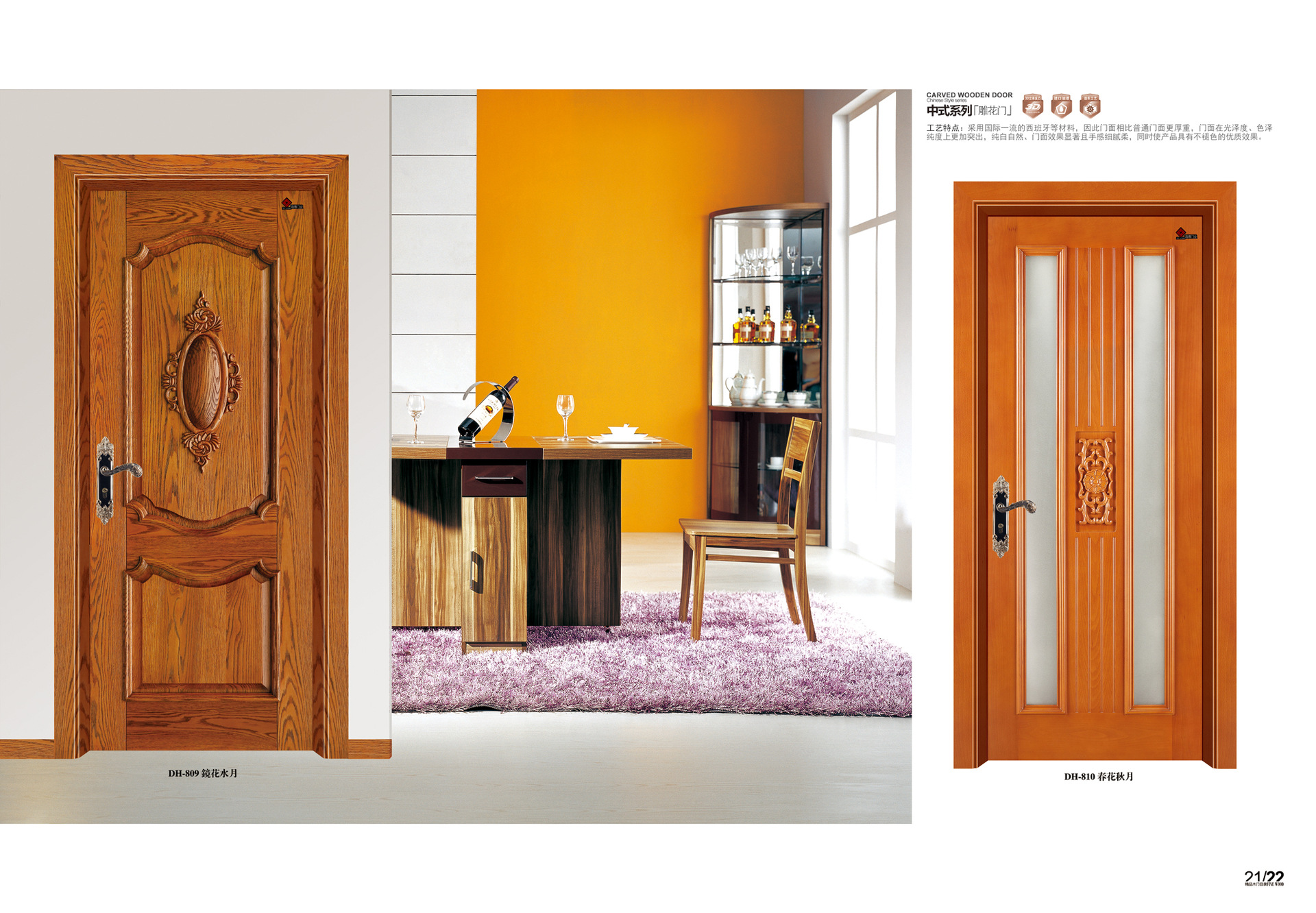 1.产品技术:经过一系列的切割,开槽,造型,抛光等工序,将8mm中密度板(MDF)用作门扇的平面。组装和干净外缘。填充材料为密度板龙骨.southern杉木被选为木料。