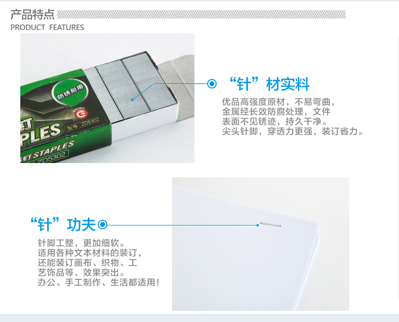 优品的高强度原料,不易弯曲,金属经过长期防腐处理,锉刀表面无锈蚀,经久耐用,针尖,穿透力强,装订力强。