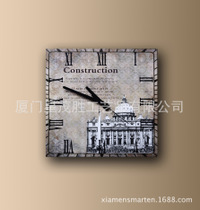2015新款创意复古挂钟亚克力方形古建筑天性静音木质钟表厂家直销
