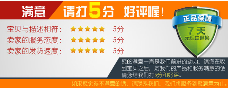 该公司照料到大多数用户的需要,并尝试使图表与实际产品相同。但是,由于不同监视器的显示功效不相同,因此在实际图像和实际产品之间一般而言会出现轻微的色调误差,这是正常的。由于质量疑问,请勿要求退货或换货。,谢谢你的配合。