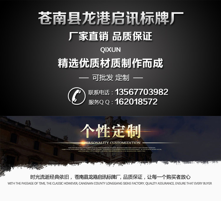 产品详情:苍南县龙港启讯标牌厂坐落浙江省苍南县龙港镇郭宕村148的一楼。近年来,他加入了互联网商店行业。首先,欢迎登录我们的商店。谢谢你。