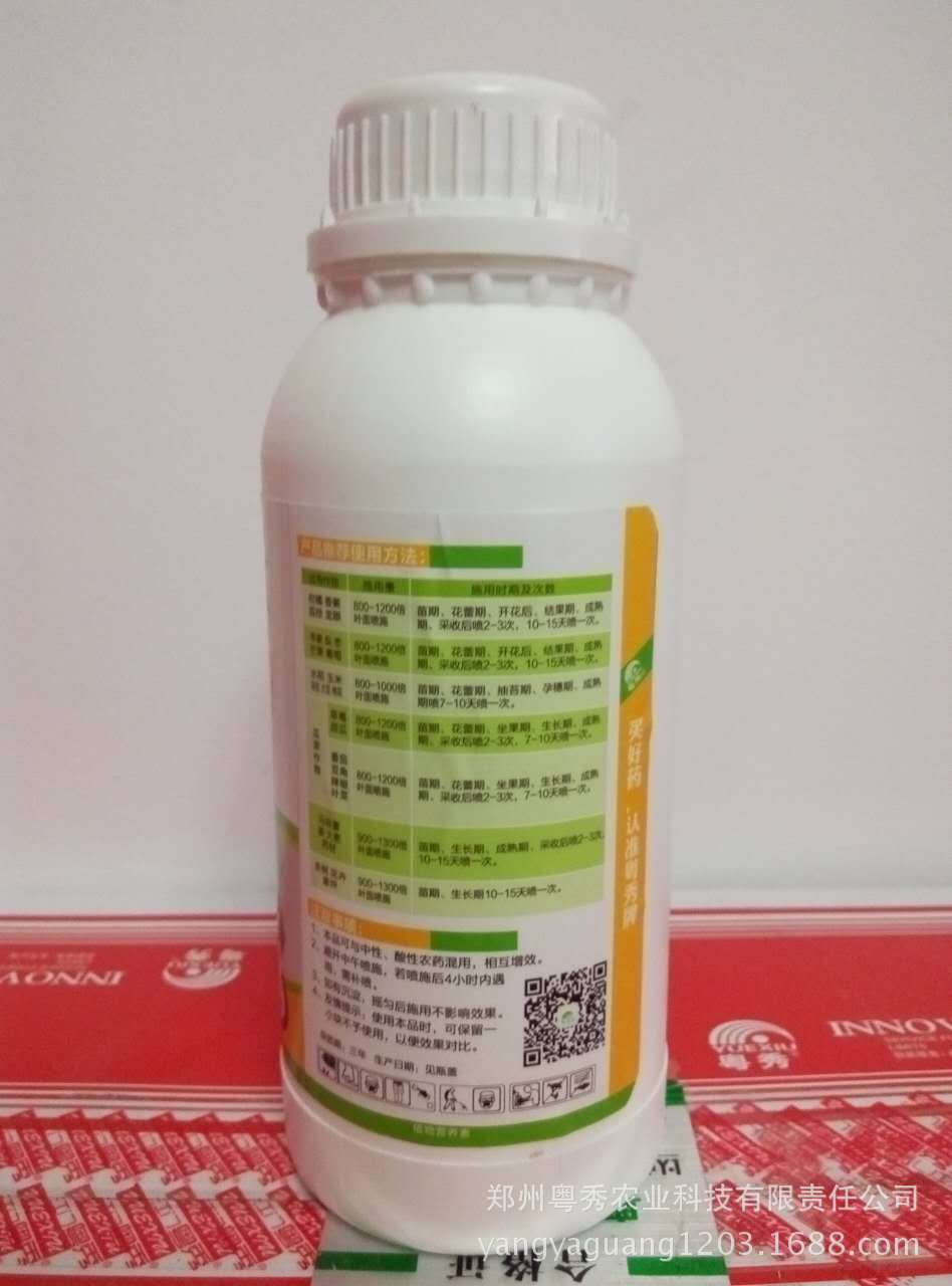 该产品是一种广谱,高效的植物营养素和生长调节剂,对多种经济作物都有显著的增产功用,可以有效调节植物的所有生长环节,迅速补充植物所需的养分要素,促进作物生长光合作用,增加作物叶绿素含量,促进根系发育和结实幼苗生长。促进花芽分化,增加开花坐果率,减小畸形果实,有效防止过早年老,延长采摘期。它还兼具增加糖分和着色的效用,以防止水果破裂,从而提高产量。