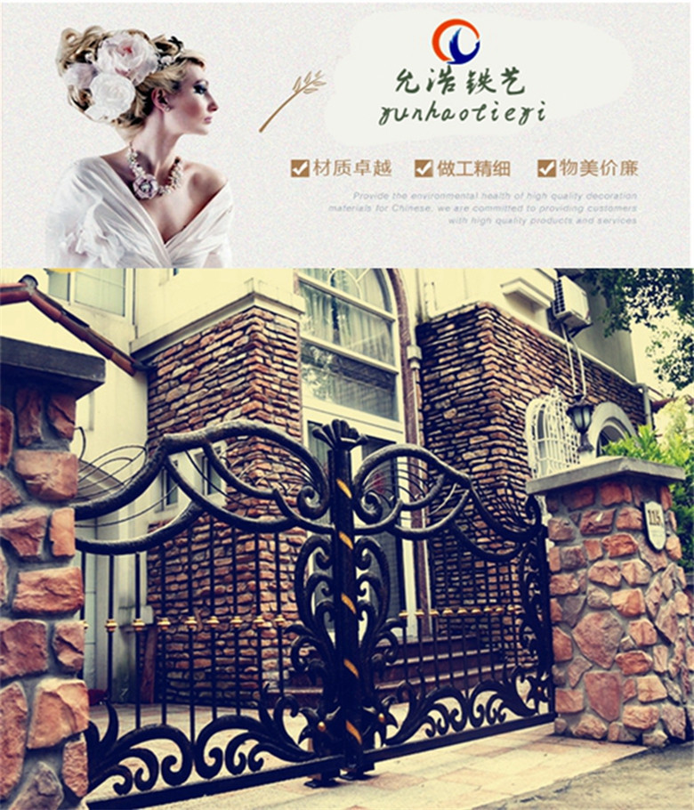 允浩铁艺厂是一家专业生产和制造:欧式锻造豪华楼梯扶手,别墅门,庭院门,防盗门窗,家庭工程围栏,阳台护栏,屏风,隔板,花架,家用家具系列等铁艺产品。我厂生产的铁产品均为锻造优质产品。每种样式和形状均经过手工仔细雕饰。它是美与天性的结合,既实用又艺术,可以根据客户的创造力以及产品的不同规格,尺寸和要求进行生产,如果进行热浸处理,则可以达到产品的效果。绝不生锈,高标准生产...