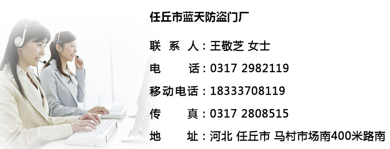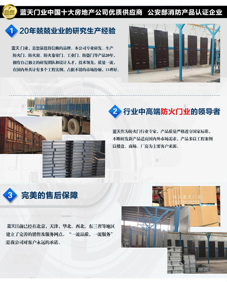 蓝天门业是最大的门窗制造商华北地区,专门生产钢质防火门,木质防火门,防火窗,防盗门,防火卷帘门,不锈钢工艺门,车库门,地窖门公司保有先进的专业生产装置和生产线,丰厚的技术力量和先进的管理经验。框架采用三维设计,具抗冲击,抗老化,耐腐蚀,无腐蚀的优点。锈。经典风格与现代技术的完美结合反映了门的造型技术和实用价值。它在当前的门市场中兼具与众不同的风范和超凡脱俗的工艺。内部的专业设计合理,量身定制,可满足您特别场合的艺术和功用需要。