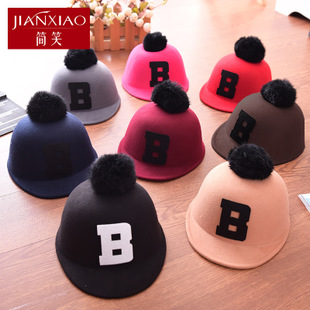 韩版儿童马术帽秋冬男女宝宝帽子仿羊绒毛毡帽带球字母潮帽批发