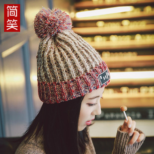 秋冬女士毛线帽韩版冬季加厚贴标耳帽球彩色针织帽厂家直销