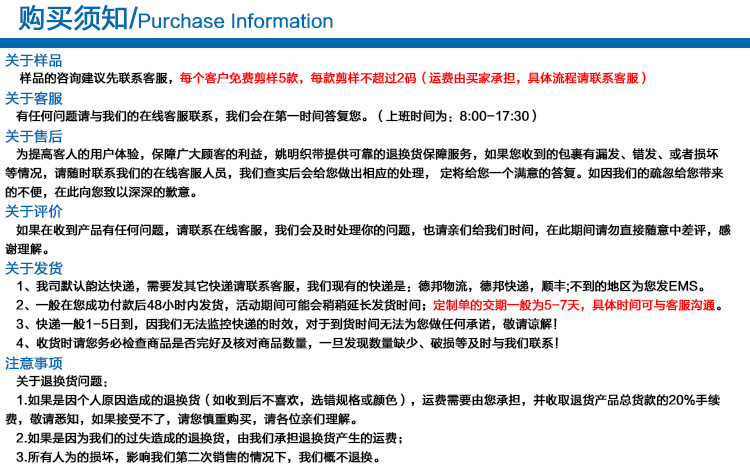 如果由于非质量疑问需退货或换货,则将收取退货总额的20%的手续费,由买方肩负往返运费。