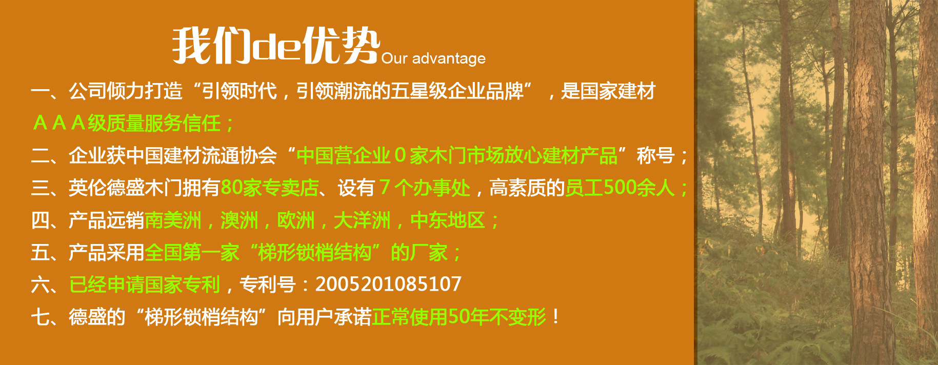 英伦德盛木门是一家专业生产高档华丽原木门,实木门,墙板和其他总体家居饰物的企业。风格新颖,具有强烈的正直感和立体感。秉承为顾客提供一站式购物的理念,并与全国第一品牌汇泰龙五金卫浴装饰材料公司协作,为顾客提供以下装饰产品:纯铜和不锈钢门锁,木门五金配件。以及高端铝合金门窗,304不锈钢套装门,防盗门,装甲门,HDF,MDF,PVC,生态环保门,polymer夹板门等。德盛木门所有材料均由高档进口柚木,玫瑰木,黑胡桃,菠萝格,沙贝利,斑马木,金丝柚,胡桃木,樱桃木和其他原木制成。该产品经过严格的工艺严格煮沸-消-干燥处置。经过德盛木门experts的长期研究和试验,好不容易克服了木门四个角格局和变形的毛病。该产品使用了国内第一家“梯形锁构造”制造商,并申请了国家专利。专利号:2005201085107。德盛的“梯形锁销构造”向用户保证,在正常采用50年后,它不会变形!