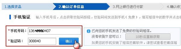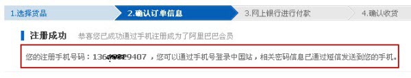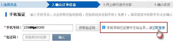 步骤2:确认订单信息页面,并通过手机号码验证方式注册为中文站member
