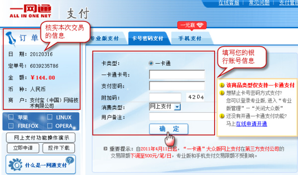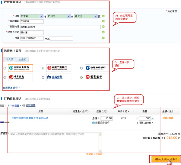步骤3:确认订单信息页面,填写送货地址确认,选择在线银行,确认订单信息,然后单击“确认订单”按钮。