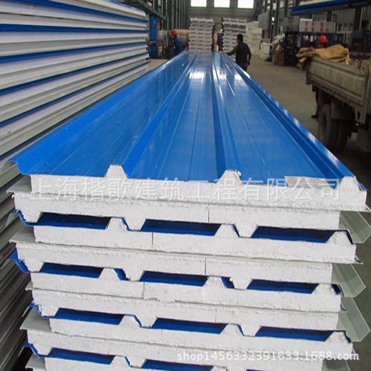b.不燃性:a级,950瓦楞彩钢夹芯板集瓦楞板和夹芯板的强度是平常扁平彩钢夹芯板的三倍,用到隐蔽的自钻螺丝连接到屋顶桁架,在不侵害色调的状况下,涂层板的裸露部分可延长彩钢夹芯板的使用寿命;板与板之间的连接使用扣帽式,便于施工,提高了效率,最大的特色是不易渗漏。岩棉保温彩钢夹芯板以芯材和其他天然矿石为主要原材料制成的玄武,在高温下熔化成纤维,添加适度的粘结剂并固化。用以工业装置,构筑物,船等的隔热和隔音,也适用于防爆和防火车间的洁净室,天花板,隔断等。