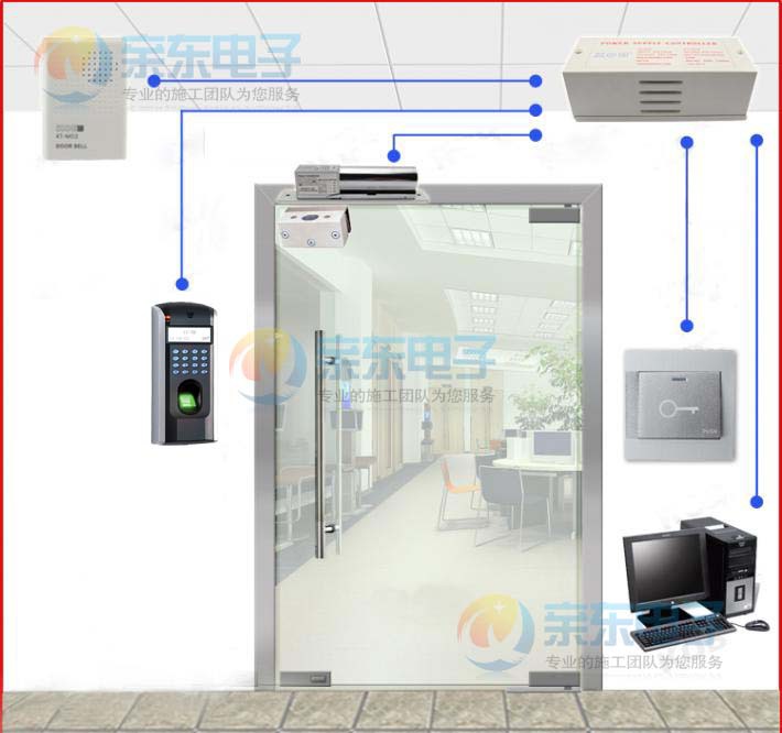 单开无框玻璃门:F7门禁主机+门禁电源+上下全无框电插锁1把+开关+门铃