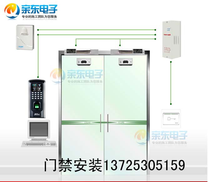 双开无框玻璃门:F7门禁主机+门禁电源+上下全无框电插锁2把+开关+门铃