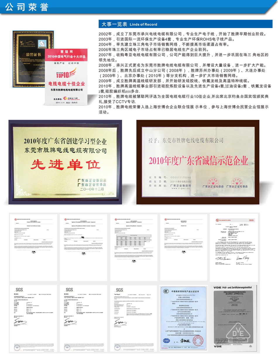 东莞市胜牌电线电缆有限公司是上海世博会民营企业馆的2010年展览单位。它是一家集开发,生产,加工和销售为一体的线材生产企业。其主导产品有硅胶线,硅胶高压线,硅胶编织线,铁氟龙热线,PVC电子线,电源线,屏蔽线和特种电线等,具备强劲的研发和生产能力。东莞市虎门镇管理区域,具备约200名职工,年总销售额超过3亿人民币。