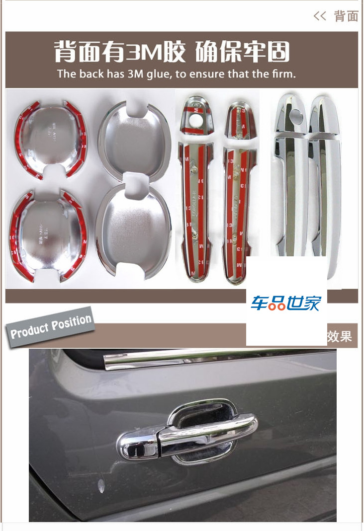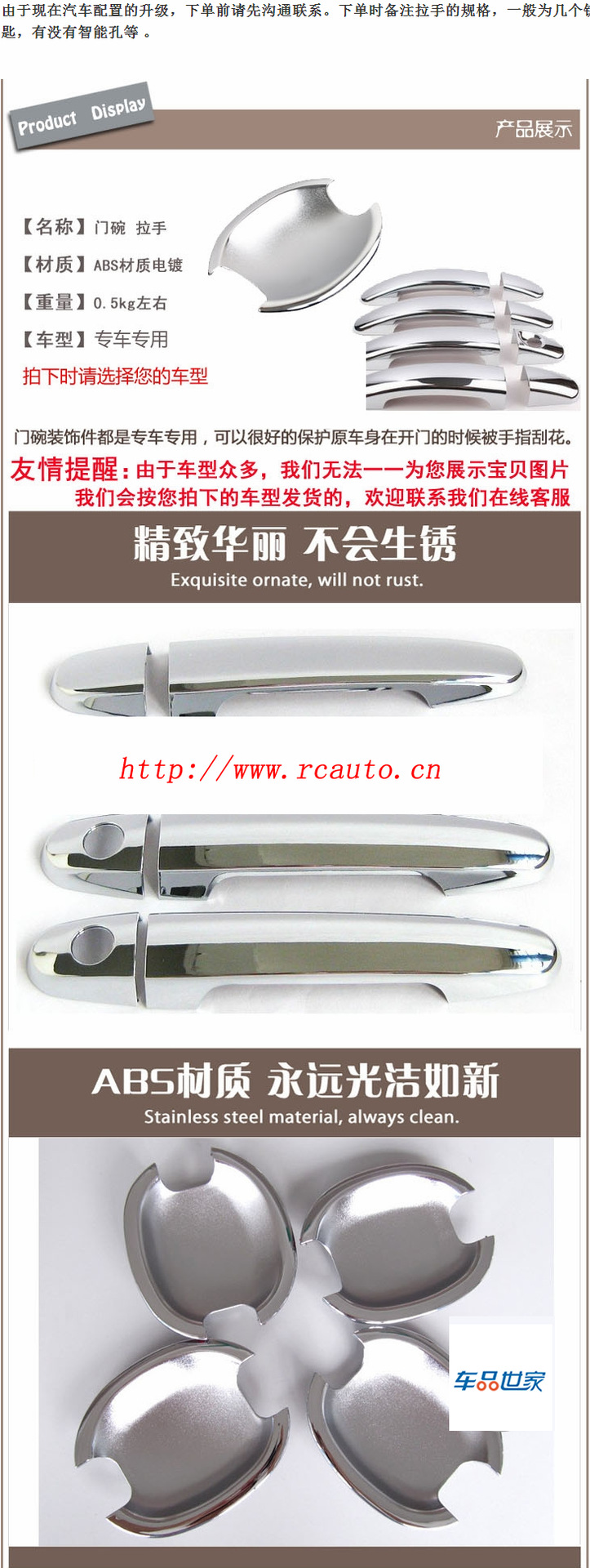 特征:塑料真空电镀,绝不生锈,不褪色,由该车型独有的模具冲压成型,与原车本身全然匹配,原厂不锈钢手柄是最老的一代,已淘汰,现在它是由塑料电镀不锈钢制成的。与不锈钢手柄相比之下,电镀不锈钢手柄的色调比不锈钢手柄光亮得多。电镀是通过塑料注射成型制成的。它容易形成且线条理想。不锈钢被冲压,并且这些线不能与注射成型的线展开比较。算是,它是金属制成的。尖角易于划伤敞开门的手腕。