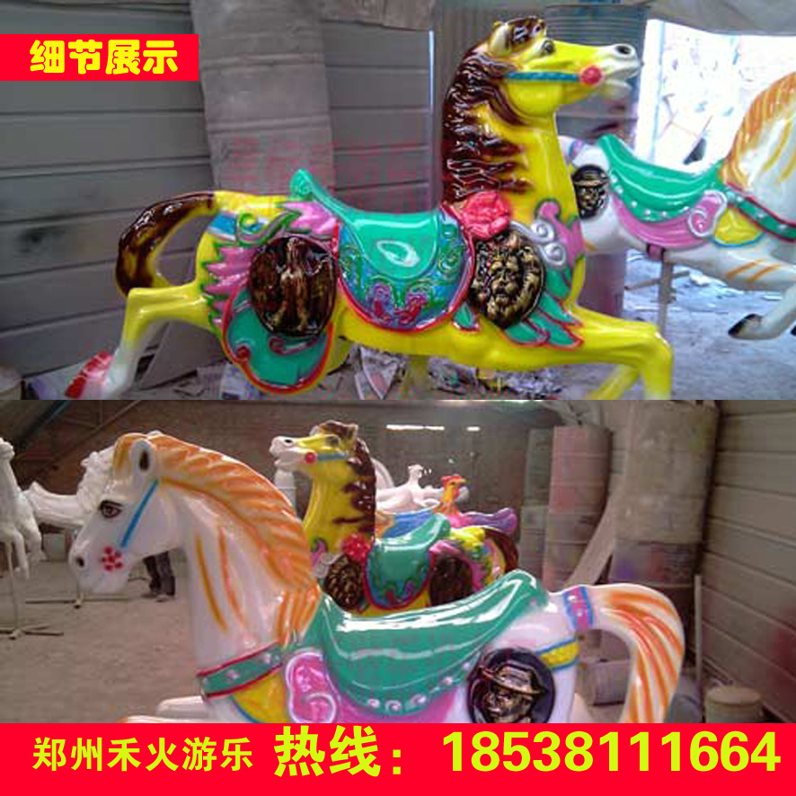 豪华旋转木马的马匹和饰品均由玻璃纤维提高塑料制成,具环保,安全,耐腐蚀和安定的特色。可以根据现场条件展开定制。