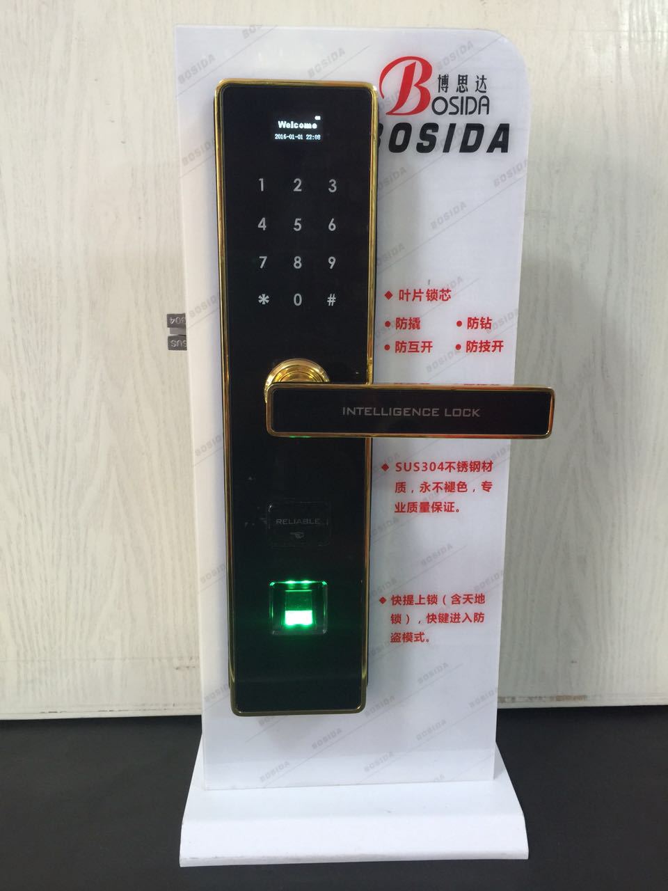 博思达锁业主要批发和零售304不锈钢拉手锁球锁外观防盗门锁指纹密码锁刷卡锁铜锁芯不锈钢锁体富丽堂皇拉手闩锁闭门器导轨及其他各种五金装饰配件。