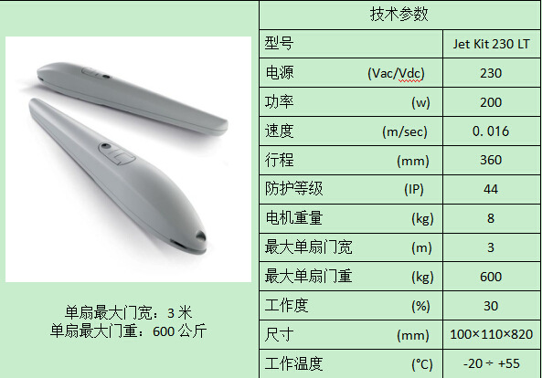 Jet直臂平开门电机套件包括:2根直臂平开门电机,1个控制器,2个遥控器,1对红外光束。