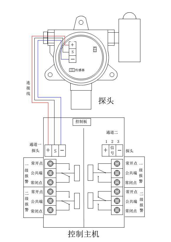 两路主机:尺寸:2通道控制器:360*150*75mm;接线方式:三线制;可以同时控制2个探测器,独立工作互不影响!
