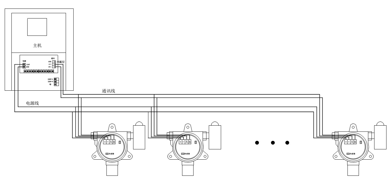 多个检测器的“ +- ”连接到主机的电源输出“+24VGND”,检测器的通信线“ab”连接到主机之一的通信“A-1B-1”,通讯接线时,导线屏蔽层均已连接,并且屏蔽层已连接至主机通讯“gnd”。