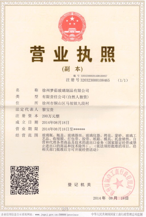 徐州梦茹玻璃制品有限公司是玻璃瓶,玻璃罐,饮料瓶,蜂蜜瓶,罐头瓶,葡萄酒瓶,软木塞,麻油瓶,酱菜瓶,工艺瓶,葡萄酒瓶,工艺品,氧化铝盖,香水瓶,铝盖,电镀盖,塑料盖,马口铁盖,烛台,橄榄油瓶和其他产品有限责任公司(自然人入股或拥有)。
