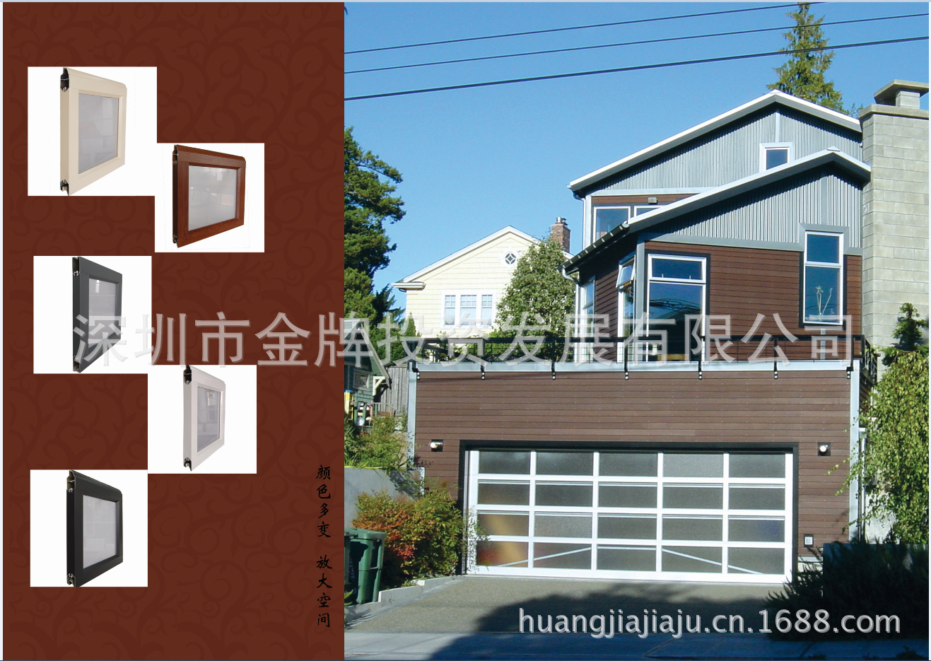 皇嘉目前的产品分成两个系列:铝合金门窗系列和车库门系列。铝合金门窗包括铝合金电动百叶窗门,店铺门;车库门系列包括彩钢发泡车库门,铝合金透视翻板车库门,实木车库门等。产品设计时尚,充满浪漫和自然的北美style。产品种类多样,可以遮盖大多数国内高档别墅的建筑风格。