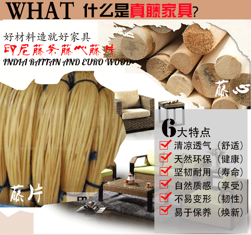 ★主要原材料:欧洲进口山毛榉木,顶级印尼玛瑙藤,泰国水草,一流的面料,皮革,pe藤,pvc藤等,藤色和各种