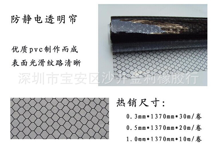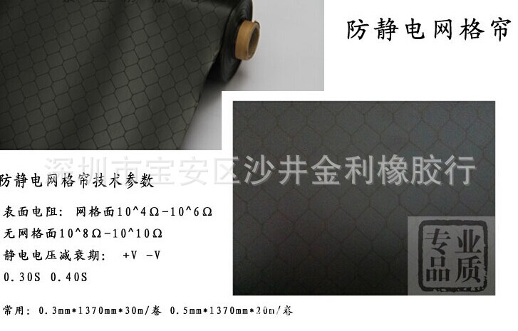 产品详情:防静电透明格栅帘:(格栅表面电阻值:10至4-6功率,另一侧电阻值:10至8功率)规格:厚度0.3mmx1370mmx30m/卷厚度0.5mmx1370mmx30m/卷广泛采用电子车间和电子装置中的防静电隔室和隔板的安装。