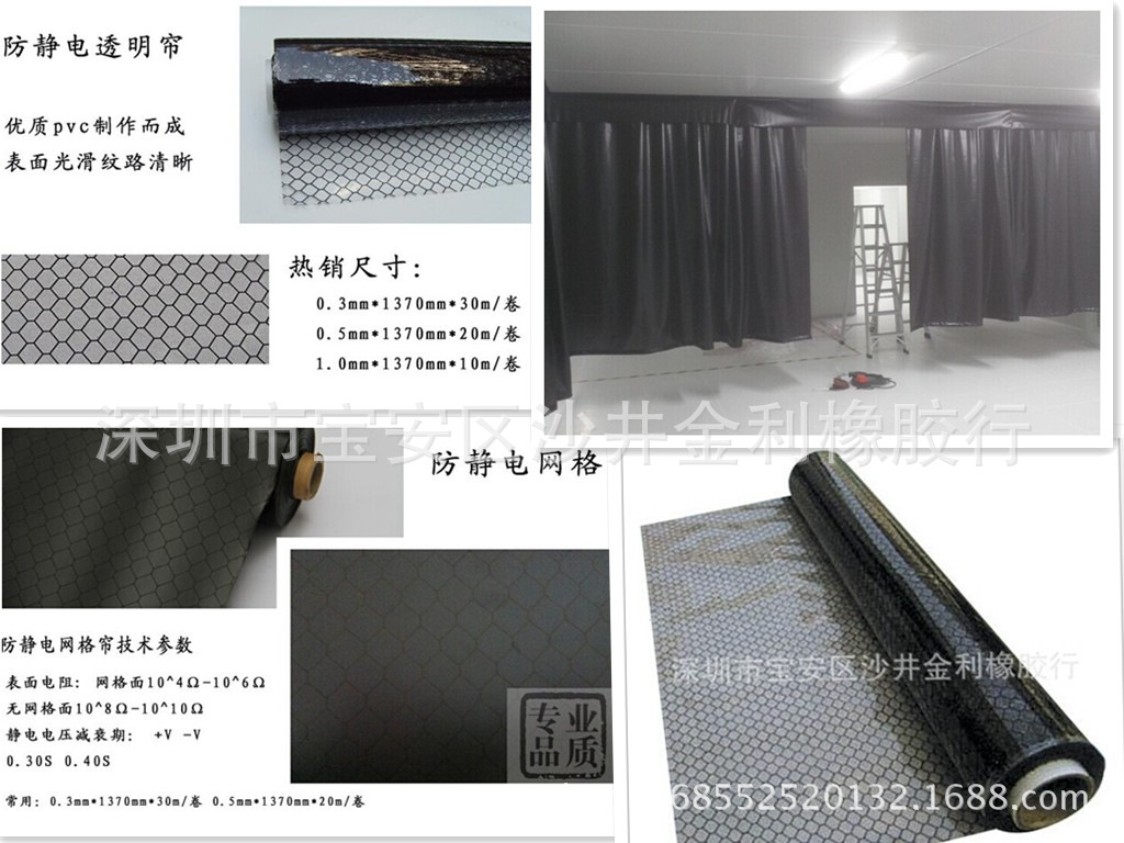防静电透明窗帘:(无网格)电阻值:10至8次方。规格:厚度0.3mmx1370mmx30m/卷厚度0.5mmx1370mmx30m/卷广泛用于电子工厂和电子装置采用的防静电隔间和隔断。