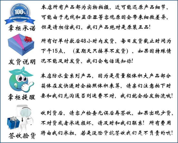本店所有产品均为厂家直销。毫无疑问,价钱优势。有些人告知我们的客户服务,许多卖家与我们有相像的东西,但是价位要低得多。在这里,我声明这家商店的所有产品均为厂家直销。,目前并未代理商和分销商,也不会给其他卖家以诽谤,假冒,假冒,假冒等行为,例如,同一产品,专卖店和假冒产品的价钱和质量全然不同。如果您需要廉价低质的产品,请绕道而行。这家商店不讲价。