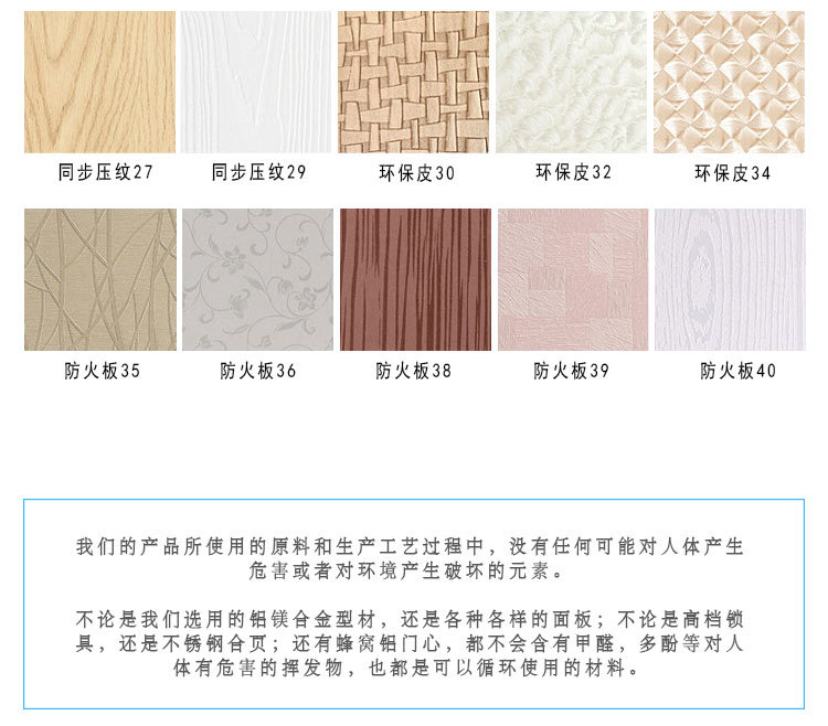 1.蘑菇云生物门的主要基材使用欧美市场上最流行的环保板材“奥松板”,表面使用HPLprepainted防火涂料。该产品具有耐磨性,耐刮擦性,阻燃性和防潮性。