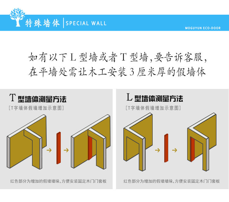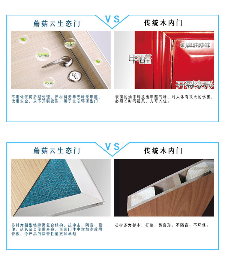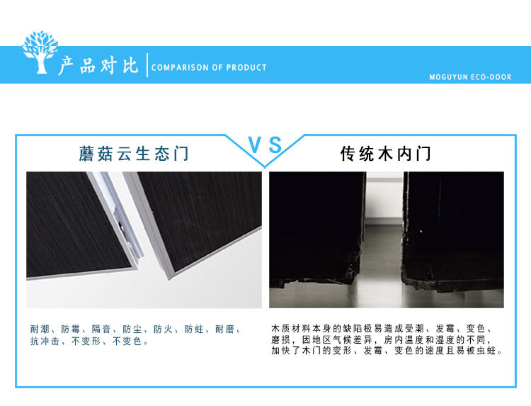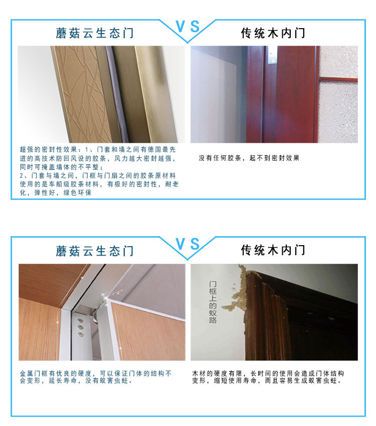 3.门框是防潮的且不会变形:门框的背面和底部使用蘑菇云与众不同的防潮技术。与同类产品相比之下,蘑菇云的门框具有更好的防潮效果。
