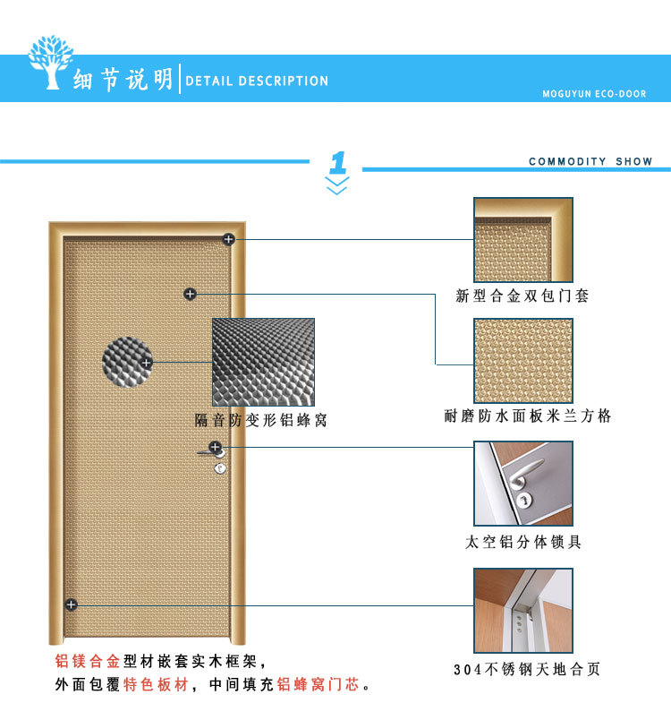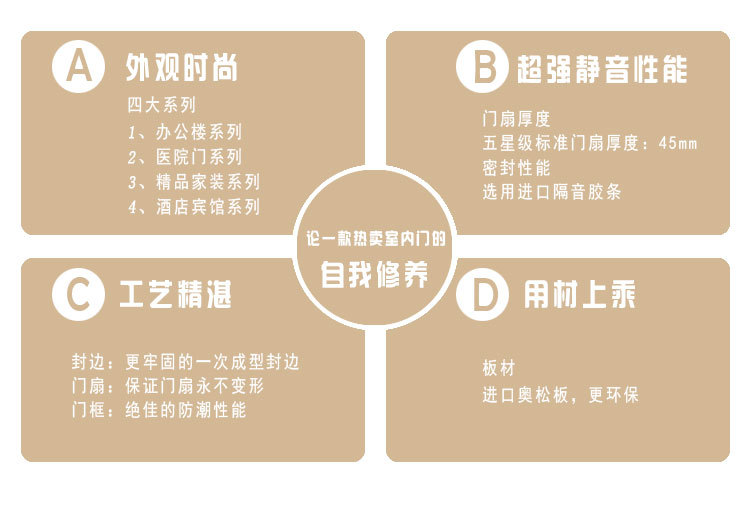2.门扇不变形:引致门扇变形的因素很多,面板基板,胶水,工艺等都会影响门扇的变形。蘑菇云奇特的抗变形能力流程(已申请专利)使蘑菇云成为制造商,确保其门扇将不会变形。