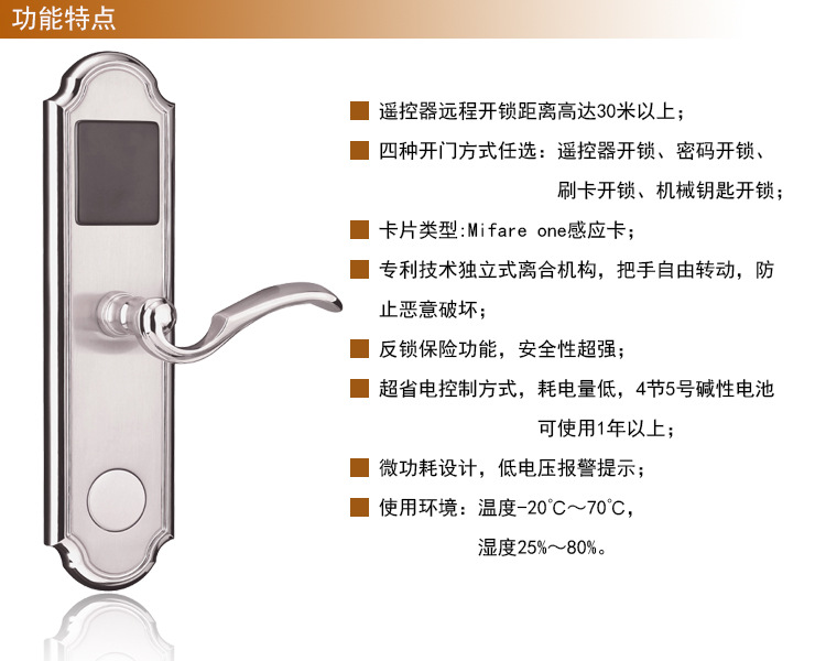 国际标准五舌构造:使用国际标准五舌联动锁芯,防滑安全舌,室内防锁大方舌,机械钥匙紧急打开门;装备了防倾斜的插入警报提醒功能,可防止任何人尝试使用名片或身份信息(通过将名片插入缝隙将门非法打开)。