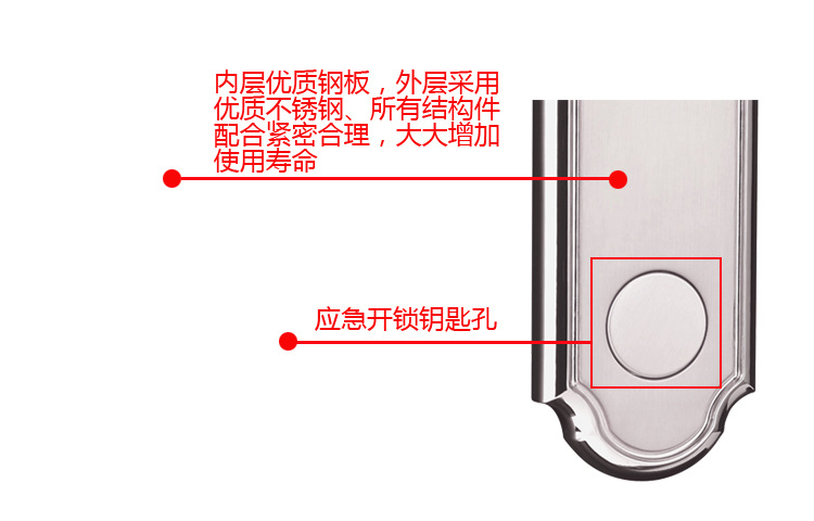 机械紧急钥匙:配置有防止技术打开的机械钥匙,以保证在紧急情况下可以打开门锁。