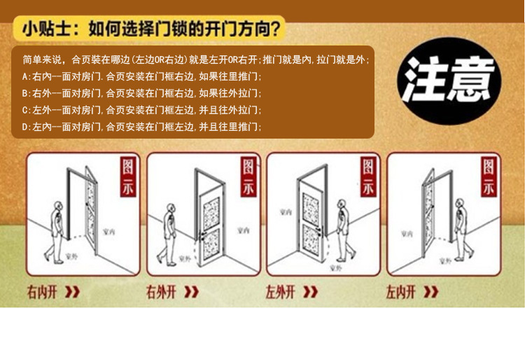 安装要求:门的厚度在38-55mm之间。如果门表面有花边,则花边应与门的边沿相差105mm以上。