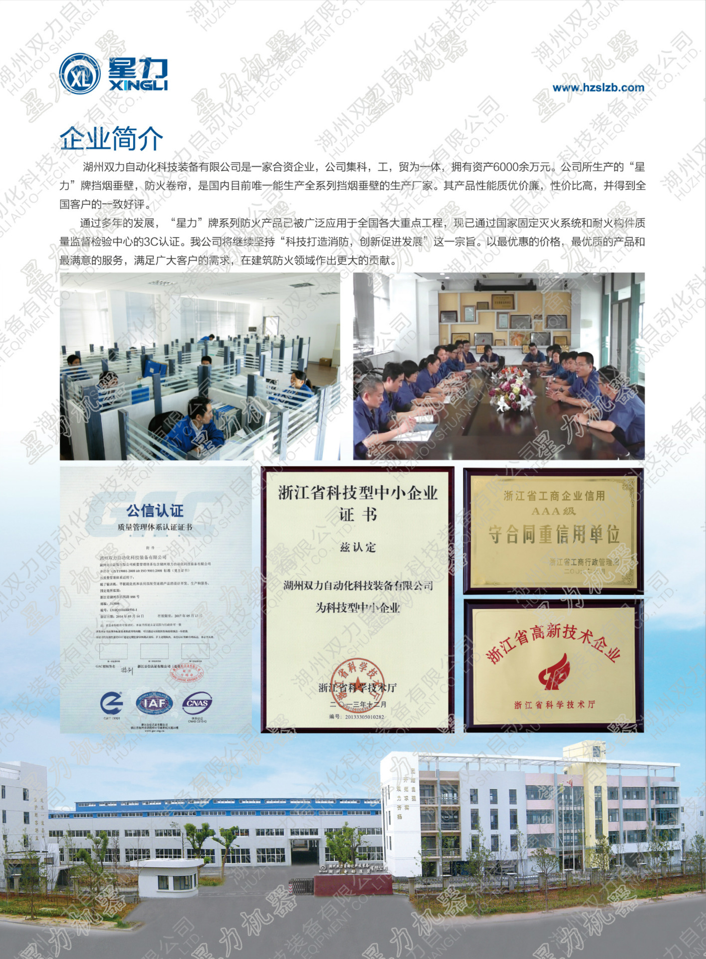 湖州双力自动化科技装备有限公司是一家合资企业,公司集科,工,贸于一体,财产超过6000万元。该公司的“兴利”牌防烟墙和防火百叶窗是中国唯一可生产全系列防烟墙的制造商。其产品质量高,价钱低,性价比高,取得了全国客户的一致好评。