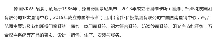 产品详情:德国VKASI品牌,成立于1986年,源自德国慕尼黑市,成立于2013德国维卡斯(香港)铝业科技集团有限公司亚太直销中心,成立于2015德国维卡斯(四川)铝业科技集团有限公司中国西南直销中心,产品范围主要关乎节能环保桥门窗的研发,设计,销售,生产,安装和服务,包括系统,窗纱集成门窗系统,铝木合格系统,防盗纱窗系统,阳光房节能系统,五金配件等产品系统等