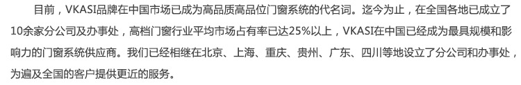 目前VKASI品牌早已成为中国市场上高质量,高档门窗系统的代名词,到目前为止,早就在全国成立了十多个分支机构和办事处,平均市场高端门窗行业的份额已达到25%以上。VKASI在中国已成为最具影响力和规模最大的门窗系统供应商。我们已先后在北京,上海,重庆,贵州,@loc设置分支机构和办事处。@,广东和其他地方,为全国各地的客户提供最新的服务。