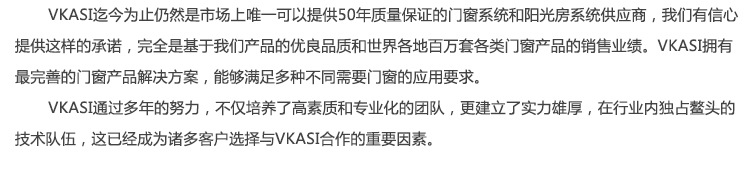 VKASI依然是市场上唯一可以提供50年质量保证的门窗系统和阳光房系统供应商。我们有信心提供这样的承诺,这全然基于我们产品的杰出品质以及全世界数百万套各种种类的门窗产品的销售业绩。VKASI持有最健全的门窗产品解决方案,可以满足各种不同的门窗应用需要。