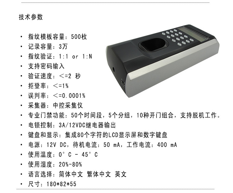 指纹读取器:直接连接到访问控制器,方法与IC/ID读头,Wiegand26输出全然相同