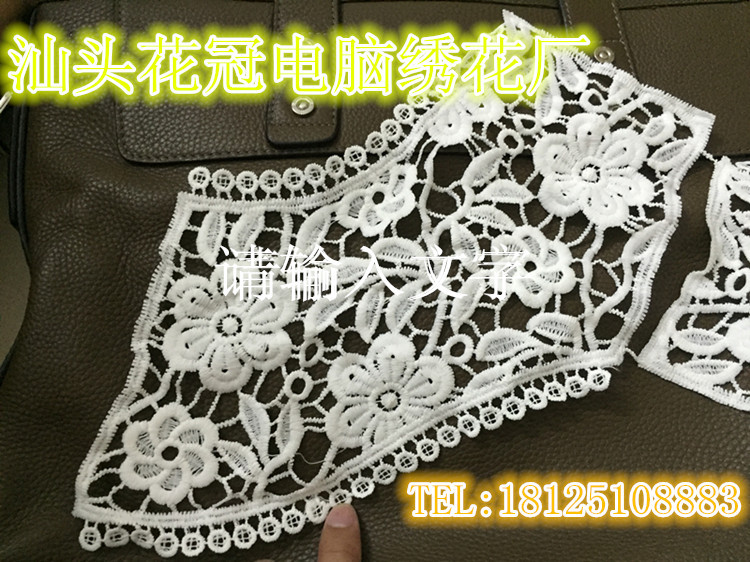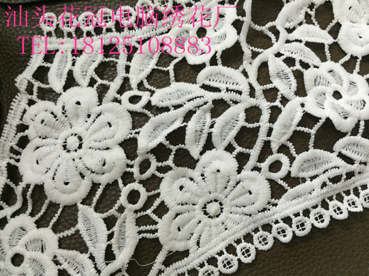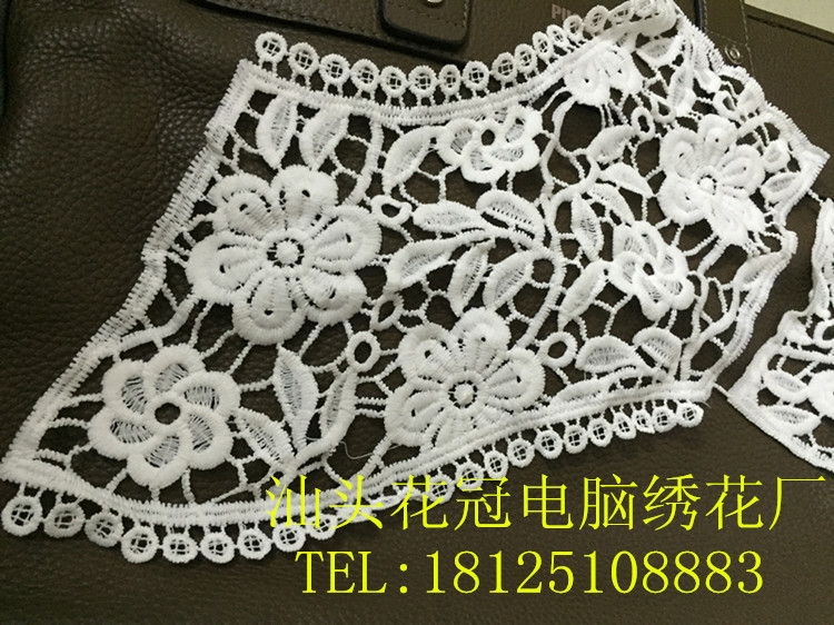 水溶性刺绣(水溶性花边):是刺绣花边的一大类。它使用水溶性无纺布作为底布。绣花线的类别包括丝织品,聚酯纤维,棉线等,它们通过电脑平绣机绣在底布上,然后进行开水处理以溶化水溶性非织造底布,留给三根立体花边。本机绣花边花样繁多,绣花精美精美,均匀均匀,形象栩栩如生,极富艺术感和立体感。
