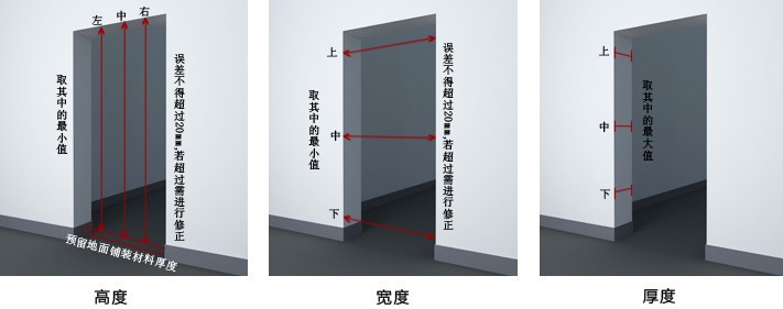 ●应在上,中,下三个位置测量门口墙的厚度,以查看墙的厚度是不是相同,同时还要查看左,右墙的厚度。门口顶部的墙相同,如果值不同则取最大,如果误差超过5mm,则须要用水泥砂浆或石灰校正墙孔。