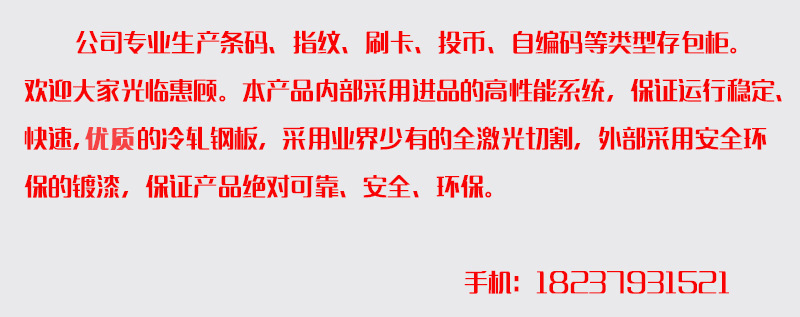 用户的指纹当做储蓄凭证;用户执行存储操作时,必须首先单击键盘上的“保存”按钮,然后在指纹收集窗口中收集指纹,然后机械会将指纹分派给用户。用到的存储盒的盒号为合并,信息将自动纪录。同时,该框自动敞开,供用户存储内容。储蓄完成后,用户关闭盒的门;操作键盘上的“获取”按钮,然后在指纹收集窗口中收集指纹。储物柜将指纹数据与之前纪录的数据展开比较,并在正确的情形下敞开该框供用户提取(机械将在该时间自动纪录时间和指纹以展开查询)。