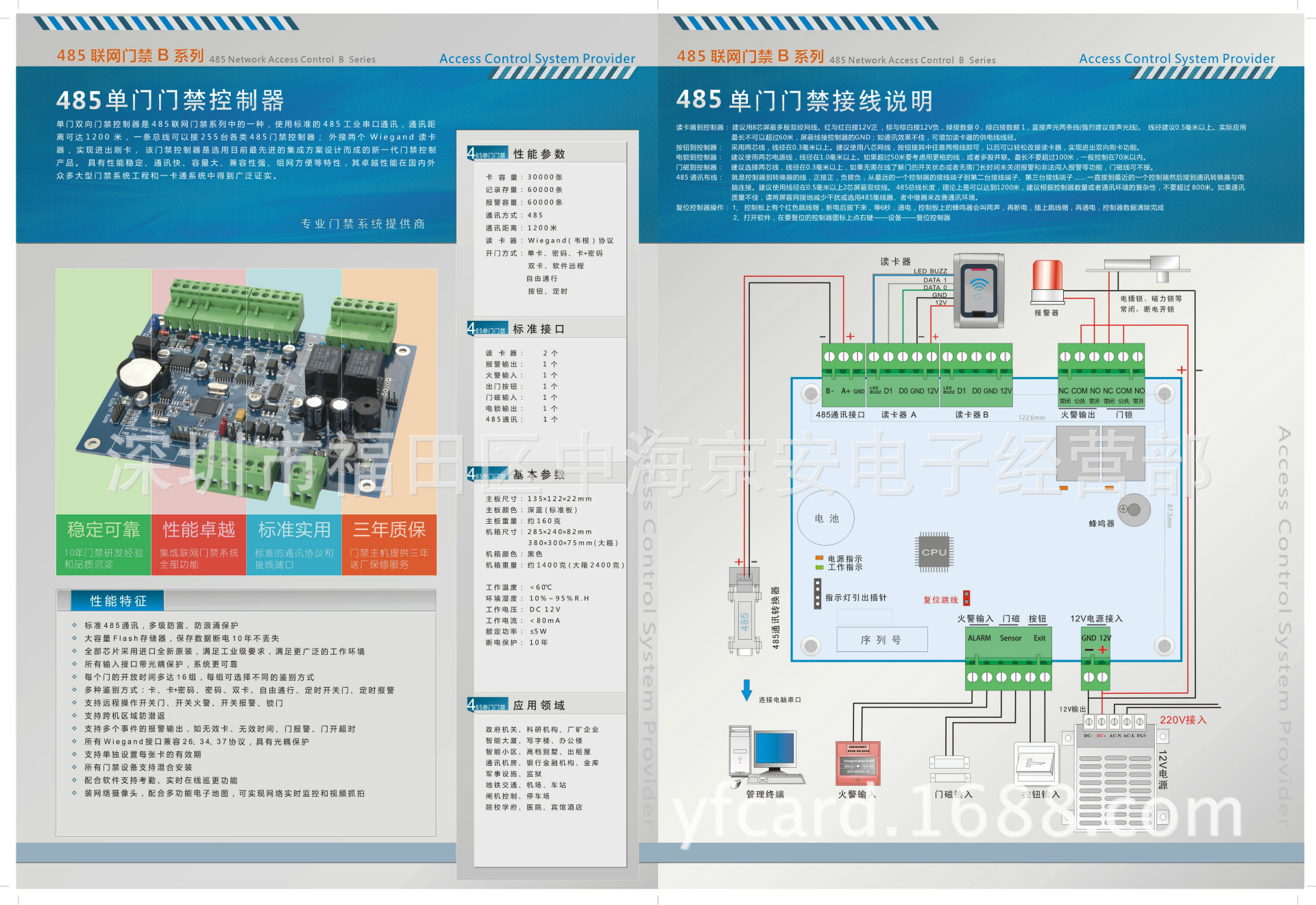 产品详情:485单门控制器,可操纵单门双向出入,继电器输出2套,报警输出1套;30,000张卡片和60,000条纪录;支持软件:简体中文繁体中文英文三种版,菜单可单独变更