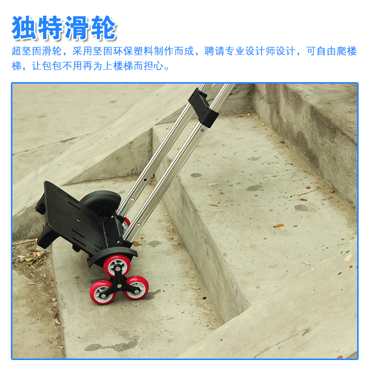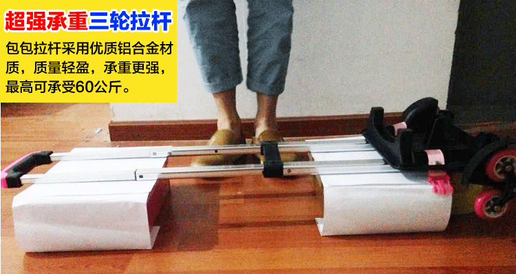 2:默认配备普通闪光轮拉杆2个轮(图片型号),可单独配备2个轮子的折叠闪光轮拉杆补差价3元和三轮楼梯爬升杆补差价7元,如果您需要联系客服来弥补差价