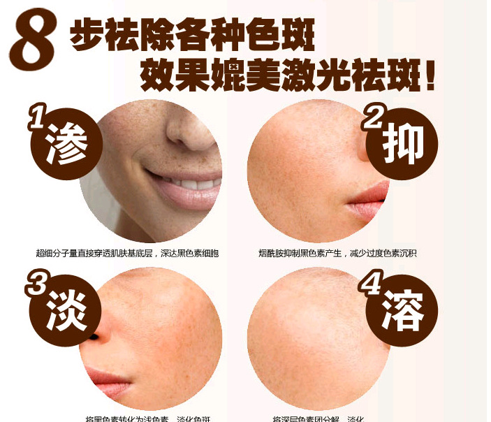 产品详情:汉药秘方为基本,从精选的纯中药材中提纯而成,临床试验验证它可以有效性溶解黑色素,对雀斑,黄褐斑,妊娠斑,皱纹有特别功用,并且可以溶解痤疮,痤疮伤疤,是的一个确实有效性的产品,可以回复您的青春并重拾您的信心。它对雀斑,美白和痤疮(痤疮)有特别效用,可使粗糙的皮肤和黑色和黄色皮肤具细致,白皙和嫩滑的效用。