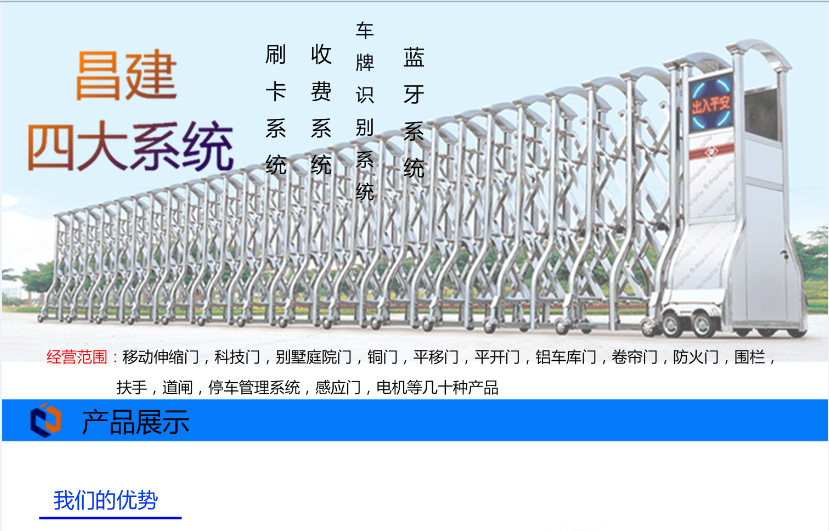 产品详情:昌建科技main,技术门,别墅庭院门,铜门,平移门,平面门,铝车库门,卷帘门,卷帘门,防火门,围栏,扶手,护栏,停车管理系统,伸缩门,感应门,马达等。昌建科技享有一支精湛的技术团队。它是设计,生产,销售,安装和保护的综合专业制造商。它能确实为客户提供技术交流和高质量的售后服务,昌建全体职工真诚欢迎您。